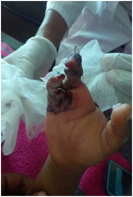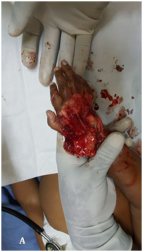 A 4-year-old male patient was relatively well 20minutes back at which time he put his right hand on meat grinder which was turned on & grinding meet. The family saw what happed after the child screamed & turned the grinder off. The family could not free the child's hand out of the grinder because it was stack in it. There was no bleeding noticed. He was brought to the hospital with his right hand stack in the meat grinder. Figure 1 He was taken to the operating theatre and under general anesthesia; the grinder was reversed with the wrench until the hand was released. The 3rd and 4th fingers were severely crashed and we did immediate amputation and the first was not injured. 2nd and 5th were fixed by k-wire and wound approximated but after 2weeks the digits became gangrenous and for which we did amputation (Figure 2).