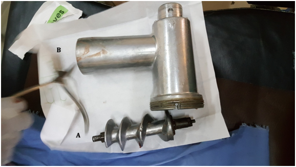 Figure 4 Crashed hand injury during reverse (anti clock wise) removal of the feed screw from head tube of meat grinder.
