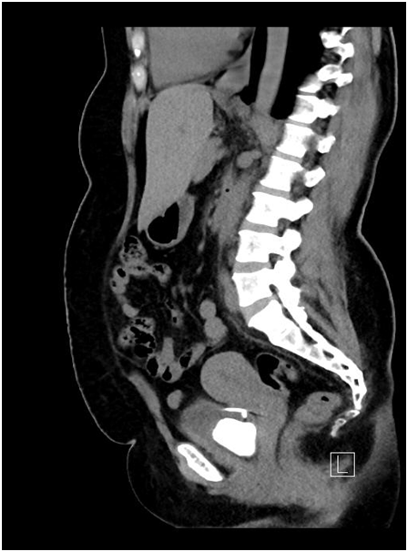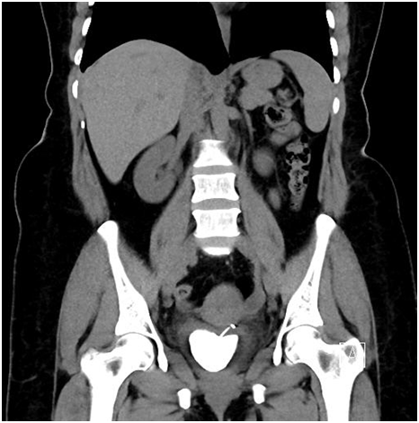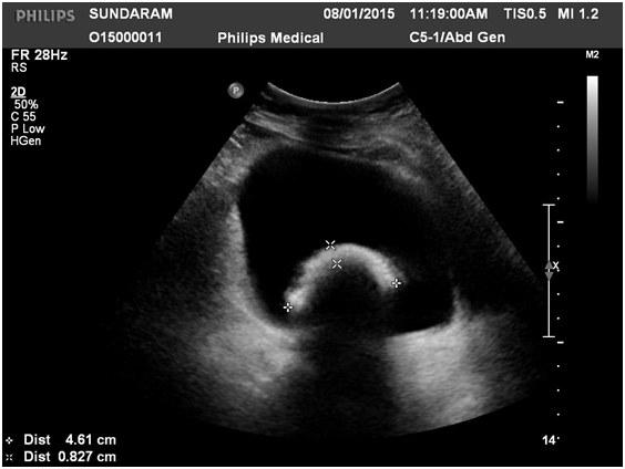 On initial evaluation with ultrasound (Figure 1) revealed a vesical calculus. On further evaluation with X-ray KUB (Figure 2) and CT Scan (Figure 3) (Figure 4) showed large laminated vesical calculus and Copper T seen outside the uterus with horizontal portion in the vesicouterine pouch, long vertical portion seen protruding into the urinary bladder lumen through the posterior wall partly encased in the vesical calculus.