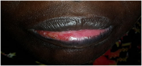A 37years old Sudanese female came to the dental surgery clinic complaining from burning sensation, difficulty in eating and swallowing and multiple ulcerative lesions started 3weeks ago after use of lip sticks without history of previous attack.