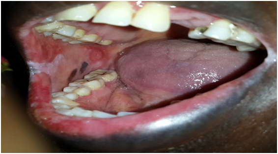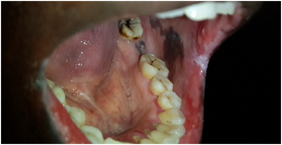Clinical examinations: Tender diffuse irregular shallow bloody ulcers affected the lower lip and bilateral buccal mucosa and oral commissures. Also bilaterally a racial pigementations were appeared on buccal mucosa (Figures 1-3). There were no detectable cutaneous target like lesions and no palpable submandibular or cervical lymphadenopathy.