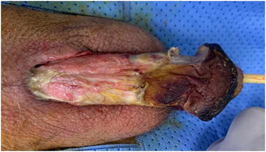 Figure 1 Dry necrosis of the cutaneous covering of the glans and the distal portion of the penis with loss of skin of the penile shaft in its proximal portion.
