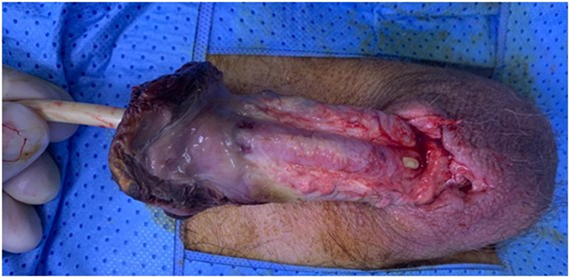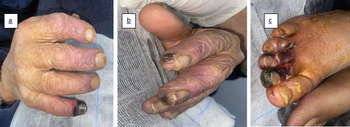 A 65-year-old male patient, known to have hypertension with end-stage renal disease undergoing hemodialysis twice weekly for 5 years, presented to the emergency department with loss of foreskin of the penis and blackish discoloration of the glans penis for 5 months associated with necrosis of the extremities of the upper and lower limbs. It is noted that the patient had received treatment from charlatans (Figure 1–3). There was no history of discharge, bleeding or trauma preceding the complaints. The patient also had a history of difficulty urinating. On examination, there was an area of blackish discoloration at the tip of the penis measuring approximately 3 x 3cm, with exposure of the skin of the foreskin and a rupture of the corpus spongiosum. The area of gangrene was sensitive without local elevation of temperature. Examination of the abdomen, scrotum, testicles and perineum was normal. Routine blood tests showed Hb 7, eGFR 13, serum calcium 9.3 mg/dL and phosphorus 6 mg/dL. A multidisciplinary surgical management between urologist, vascular surgeon and nephrologist was proposed. We proposed a penectomy with coverage using crossed scrotal flaps (Figure 4) and vascular surgeons for regularization of toes and finger pulps. Histopathological examination revealed calcifications in the intima of arteries with thrombosis and microabscesses in the epidermis.