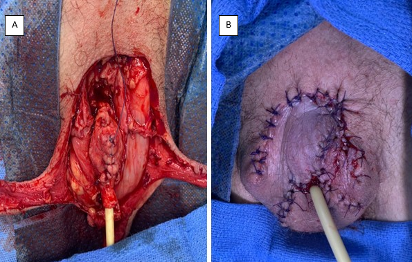 The management of these cases requires a multidisciplinary approach involving specialists from various fields such as urology, vascular surgery and nephrology. This collaboration provides comprehensive and tailored care for each patient, taking into account the different aspects of their pathology and comorbidities. Early surgical intervention, as proposed here with a penectomy and coverage with scrotal pedicled flaps, emerges as a promising alternative to free skin grafting for reconstruction of penile sheath defects. This technique provides satisfactory functional, esthetic and psychological results, with an acceptable morbidity5 limiting the spread of gangrene and preventing more serious complications such as sepsis. However, once the acute phase is managed, particular attention must be paid to managing the underlying metabolic and vascular complications in order to optimize long-term outcomes in these high-risk patients.