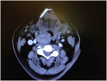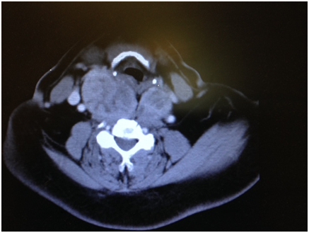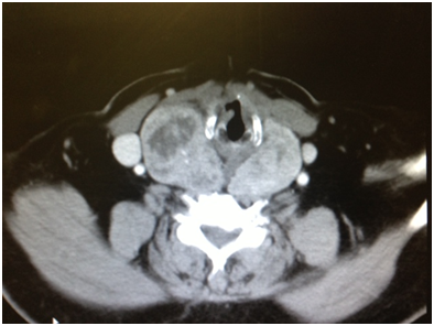 Figure 1 CT scan soft tissue neck showing enlarged thyroid displacing carotid artery on the right side.