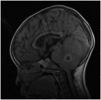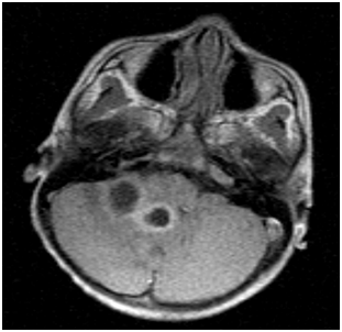 A 6year old boy weighing 14kg (expected weight=20kg) was referred to the neurosurgical unit of University College Hospital, Ibadan, with complaints of headache, vomiting, fever and unsteady gait of one week duration. There was no history of ear ache or ear discharge, scalp infection, trauma, seizure or any other systemic disorder. He was diagnosed to have multiple right cerebellar hemispheric abscesses based on Magnetic Resonance Imaging (MRI) finding of rings enhancing masses in the cerebellum (Figures 1) (Figure 2). He is a known patient of the paediatric Cardiology unit with uncorrected congenital heart defect. Pregnancy birth and neonatal history were uneventful until 5months of age when he was diagnosed with congenital heart disease and has been on follow up until this present illness. He has never been in heart failure and was not on any cardiac medication. Patient was awaiting surgery for the heart defect when he developed this present illness. His physical examination revealed a small for age child, afebrile, not pale, anicteric but has central cyanosis and peripheral oxygen saturation (SpO2) was 85% in room air with grade 2 digital clubbing.