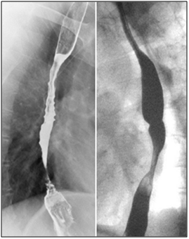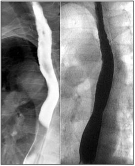 Symptoms recurred despite compliance with therapy and EGD two months later showed persistent LA Class D esophagitis without histologic evidence of opportunistic infection. A bariums wallow showed a tight 3cm long, 4 mm diameter stricture in the same location (Figure 2). Given the unusually refractory nature and mid-esophageal location of his circumferential esophagitis and stricture and no histologic evidence of Barrett’s, opportunists, or neoplasia, MMF was suspected to be the culprit. His MMF was discontinued and azathioprine was substituted. He was re-dilated to 12 mm using a through the scope (TTS) balloon. Barium swallow (Figure 3) at 3-month follow-up showed no evidence of esophagitis or stricture and PPI therapy was discontinued without symptomatic recurrence. At 2.5 year follow up he continues to be symptom free off of PPI therapy.