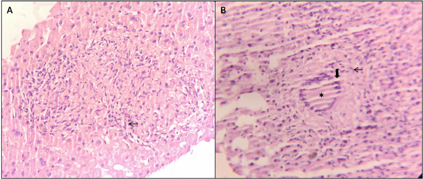 Given persistently raised liver enzymes and without any demonstrable liver parenchymal involvement on CECT, ultrasonography (USG) guided liver biopsy was performed, revealing multiple epithelioid cell granulomas with Langhans giant cells and caseation necrosis (Figure 4). Acid-fast bacilli were also demonstrated in the specimens.