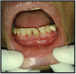 On intraoral examination, diffuse lesions in the form of erythematous areas were seen interspersed within white keratotic areas present all over the facial aspect of gingiva (Figure 2) and more posteriorly on the buccal mucosae bilaterally (Figure 3). Left buccal mucosa showed a white erythematous patch measuring approximately 2x2.5cms extending anteroposteriorly from the area adjacent to mandibular first molar to the retro molar pad area and superior inferiorly from the line of occlusion to the upper and lower lingual vestibule. White radiating striae (wickhamstriae) were present with an interspersed erythematous patch. Right buccal mucosa showed a more extensive lesion measuring approximately 2.5x3cms extending anteroposteriorly from the region adjacent to mandibular canine to the retromolar pad area and superioinferiorly from the upper gingiva buccal sulcus to the lower gingivobuccal sulcus and the alveolar mucosa. Borders of the lesion appear irregular and ill defined. On palpation, the lesions appeared to be tender. The surface of the lesions were rough and non scrapable with no induration noted.
