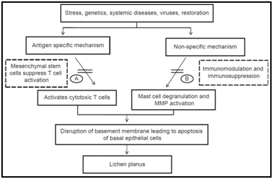 There are many antigen-specific mechanisms may be involved in the pathogenesis of OLP, including MHC class I- and MHC class II-restricted antigen presentation by lesional keratinocytes, activation of antigen-specific CD4+ helper T-cells and CD8+ cytotoxic T-cells, clonal expansion of antigen-specific T-cells, and keratinocyte apoptosis triggered by antigen-specific CD8+ cytotoxic T-cells. Apart from there are many non-specific mechanisms may be involved in the pathogenesis of OLP, including (Figure 5) The Heat Shock Proteins (HSPs), reactive oxygen species (ROS), stress, mast cell chemotaxis and degranulation stimulated by T-cell RANTES, endothelial cell adhesion molecule expression stimulated by mast cell TNF-a, T-cell MMP-9 activation by mast cell chymase, epithelial basement membrane disruption by mast cell proteases or T-cell MMP-9, keratinocyte apoptosis triggered by epithelial basement membrane disruption, intra-epithelial CD8+ T-cell migration through basement membrane breaks, inflammatory cell survival prolonged by T-cell RANTES and non-specific T-cell recruitment by keratinocyte-derived chemokines.5,6