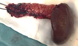 Figure 3 GIV pancreatic lesion, complete section at the level of the pancreatic neck with ductal lesion, due to blunt trauma in a polytraumatized patient.