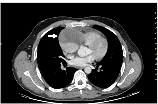Figure 2 The cavitary mass compressing right atrium and the pericardial effusion.