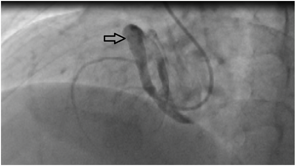 Figure 4 Giant right coronary artery aneurysm in coronary angiography (Black arrow).