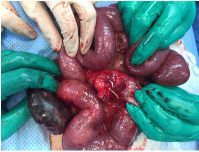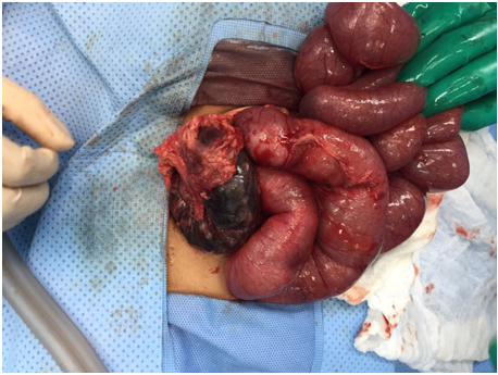 A 3-year-old male child presented to our emergency department with the complain of diffuse abdominal pain, biliousvomiting, and diarrhea for 2 days before presentation. He vomited several times moderate amount of green fluid. He had no previous abdominal operations and his medical history was otherwise unremarkable. Upon examination, the patient was conscious, he had tachycardia (heart rate of 139/minute), tachypnea (respiratory rate of 29/minute) with 100% oxygen saturation. The blood pressure was 93/43mmHg and temperature 37.3°C. He looked ill and in pain, was lying still on bed without movement. His abdomen was grossly distended, not moving with respiration. It was diffusely tender on palpation with maximal tenderness in right iliac fossa. Plain abdominal x-ray showed multiple air fluid levels. Abdominal ultrasound showed complex mass in right iliac fossa. Initial laboratory workup revealed high C reactive protein (26.1) and normal leucocyte count (5.2). The initial impression was acute small bowel obstruction. The patient was kept fasting. He received a bolus of 20ml/kg normal saline along with maintenance of dextrose 5% in normal saline. Foley catheter and nasogastric tube were inserted to calculate output. He was taken to the operating room for exploration. Through a camera port inserted in the umbilicus, the abdomen was initially explored. Small bowel was found to be dilated and a gangrenous part was noted. The procedure was converted to laparotomy through a right transverse incision. To our surprise, we found a perforated Meckel's diverticulum by chicken bone. In addition, there was a terminal ileal volvulus with a gangrene attached to an adhesional band. a wedge resection of the Meckel's diverticulum was done using Endo GIAstapler, along with resection of 15 cm of the gangrenous terminal ilium, cecum, and appendix. An Ileo-colonic anastomosis was performed, and the abdomen was thoroughly washed with normal saline before closure. The patient received prophylactic doses of metronidazole and cefuroxime both before operation and continued post operatively. He was kept fasting and started TPN postoperatively. He started to drink clear fluid on 4thpost-operativeday, and started to pass loose black stool multiple times from the second post-operative day (His hemoglobin was stable at 11.9) the patient was discharged home in good condition on 8th post-operative day. On his outpatient follow up visits after discharge, he did well with no recurrent symptoms, with no further episodes of abdominal pain or vomiting.