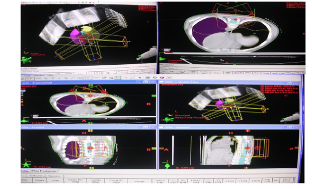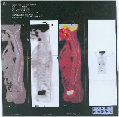 A previously healthy 5year old male child presented with complaints of weakness of both lower limbs. He had fall a week before the presentation of the weakness. His bladder and bowel habits were normal. On Examination Lansky Score 90 - minor restrictions in strenuous physical activity.1 His higher functions were normal, in his motor functions tone was normal, power was 4/5 –right Lower Limb; 3/5- Left lower limb. His deep tendon reflex, plantar and sensory systems were normal. He had scoliosis. On investigations Blood and Urine examinations were normal. Radiograph of the Chest and Ultra sonogram of abdomen were normal. Radiograph of the Dorsal Spine showed scoliosis. Magnetic Resonance Imaging of Brain was normal. Magnetic Resonance Imaging Spine showed Extra Dural mass lesion in the right dorso-lateral aspect of Spinal Cord at D 6-D 8 Vertebral Level causing significant cord compression (Figure 1). He underwent Dorsal Laminectomy with removal of Extradural SOL on 26-04-06. Per-op: Moderately vascular, Greyish fleshy mass, spreading in the extradural space extending from D-6 to D-8 level compressing the spinal cord. Near total excision was done. Pathological findings showed Small round cells with perivascular infiltration and pseudorosettes, suggestive of Malignant Primitive Neuro Ectodermal Tumour of Extra dural Origin (Figure 2). Immmuno Histo Chemistry Studies Done showed CD99 +ve , Vimentin +ve, MIC2 +ve. Post operatively Boy was treated with one cycle of chemo [VAC] Vincristine, Adriamycin, Cyclophospamide. Since there was minimal residue and Malignant histology ,a course of post-op external radiotherapy was planned using Linac using multi leaf collimator, 3D CRT Plan ,the post op tumor bed (with adequate margin ) was treated with Photons-6 MV Dosage: 42Gy in 28 # 150cGy /# over 6weeks using 3 portals. At the end of radiotherapy (Figure 3). Patient was able to walk with Spinal support. Post op and Post RT Post RT 3 more cycles of VAC and 4 cycles of Vincristine, Actinomycin-D, Cyclophospamide alternating with 8 cycles of Ifosfamide and Etoposide were given starting from May 2006 to March 2007 and the patient withstood the treatment without major morbidities. PET scan of the whole body done in Jan 2007 showed Radioisotope: 18F-FDG-370MBq/45min uptake. PET-3D mode and CT Extent of study: Base of skull to upper mid third of thigh, showed no evidence of any active disease anywhere in the body (Figure 4). Patient is now in complete remission and on follow up for 10years (Figure 5).