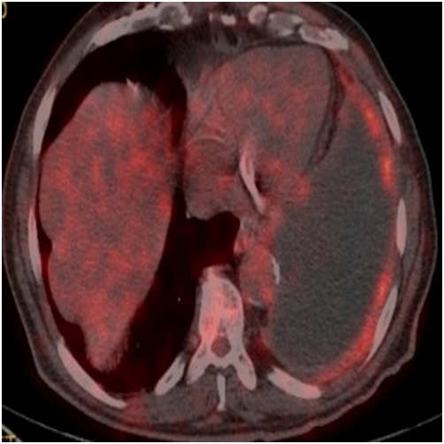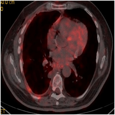 Figure 1 FDG (SUV max:7) uptakes in plaque-like common pleural thickening areas be about more pronounced in the middle and lower zones on almost all surfaces of the right hemithorax pleura.