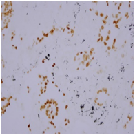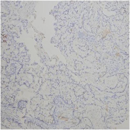 A sixty-five year-old male patient was admitted to our clinic with complaints of cough and shortness of breath for 7-8months. He was an active smoker for forty-five packets/year, he had not asbestos exposure. 1000cc serohemorrhagic fluid was drained from the patient. No malignant cells were detected on cytological examination. Parasternal emphysema in both lungs, volume loss in right hemithorax and advanced pleural effusion were observed in thorax computerized tomography (CT). Fluorodeoxyglucose (FDG) uptake (SUV max, 7), FDG uptake in several lymph nodes (SUV max, 3.7-4.8) in the right sub paratracheal and subcarinal area of the mediastinum (Figure 1) were present in plaque-like pleural thickening areas be about more pronounced in the middle and lower zones in positron emission tomography (PET-CT) on almost all surfaces of the right hemithorax pleura. Video-assisted thoracic surgery (VATS) was performed with mesothelioma doubt. Tumor showing vascular invasion in places was observed in the form of multifocal small foci and nodulations on visceral and parietal pleura in pathological examination of wedge resection and partial parietal pleuractomy material taken from right lung upper lobe and lower lobe. In immunohincistochemical researches, TTF-1 (thyroid transcription factor-1), CEA (carcinoembryogenic antigen) and CK-7 (cytokeratin-7) were positive,staining with CK20, CK5/6, Melone A, HMB45, WT1 (Wilms tumor) and calretinin was not seen (Figure 2A) (Figure 2B). Intraplasmic mucin staining was detected with PAS-Alcian Blue histochemical staintumor primer was evaluated as lung adenocarcinoma. Progression and pulmonary embolism developed after the 3rd cure in patient who underwent chemotherapy after pleurodesis. The patient died with respiratory insufficiency at the fifth month of follow-up.