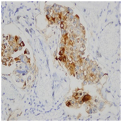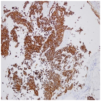 A seventy-five year old male patient referred to our clinic for dyspnea and involuntary weight loss. He was an active smoker for one hundred thirty packets/year, he had not asbestos exposure. Patient was hospitalized to our clinic for pleural effusion and infection six months ago and no malignancy was detected in Thoracic CT and fluid cytology. The patient whom fluid was lowered with ant biotherapy was discharged at the end of the treatment so as to come to the control. Massive effusion was determined in the left hemithorax in the patient who reapplied on the increase of symptoms. Irregular FDG uptake was present in the areas of common linear nodular thickening in the left hemi thorax pleura on PET/CT (SUV max 7.2-11) (Figure 5). Tumor cells composed of invasive glandular structures in the pleura and with mucinous material in cytoplasm were detected as a result of VATS. The tumor is negative in the pleural fluid. CK8/18, CD15, CEA, CK7 was positive and D2-40, calretinin; WT-1, TTF-1 and CK-20 were negative in immunohistochemical staining (Figure 6). Chemotherapy was started to the patient who was diagnosed with invasive mucinous adenocarcinoma.