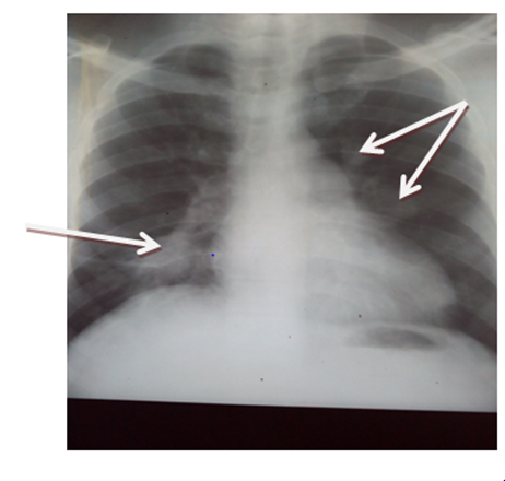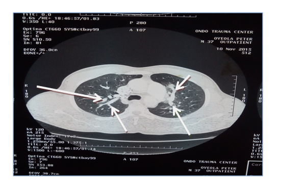 The results of laboratory investigation revealed packed cell volume (38%). Other cells counts were within normal limit but for the peripheral blood film that showed microcytes, macrocytes and anisocytosis. Chest radiograph showed widespread rounded opacities in both lung fields while constrast enhanced CT scan revealed bilateral multiple saccular dilatations of the pulmonary arterials in keeping. Sputum for acid and alcohol fast bacilli and Gene expert (negative), erthrocyte sedimentation rate (40mm/hr), Hepatitis screening (HBsAg, Anti-HCV were both negative), HIV rapid serology test (negative), and VDRL for Syphilis (negative). The values of Anti-Nuclear Antibody, pANCA, cANCA were within normal limit and pathergy test was negative after 48hrs.