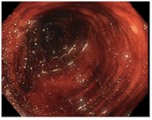 A 72-year-old man with a history of diffuse large B-cell lymphoma of an intra-abdominal lymph node at the pancreas head 5 years prior presented with acute onset rectal bleeding associated with syncope. He had a history of decompensated cirrhosis due to primary sclerosing cholangitis (PSC). He had no history of varices or variceal bleeding and was on antiplatelet therapy with aspirin and clopidogrel. On presentation, his temperature was 94.20F, blood pressure, 103/55 and heart rate, 92 beats per minute. Physical examination revealed conjunctival pallor, ascites, abdominal distention, and spider angiomas. His initial hemoglobin was 5.4g/dL (baseline 10.0 g/dL). The patient was resuscitated in the ER and underwent abdominal CT angiogram that revealed no evidence of active bleeding or abdominal varices. He underwent initial endoscopic evaluation with a push enteroscopy and colonoscopy, which showed only portal hypertensive gastropathy (Figure 1), sigmoid diverticulosis, blood throughout the entire colon (Figure 2). There was clotted blooded at the ileocecal valve. He continued to have hemodynamically significant active hematochezia; nuclear medicine bleeding scan demonstrated active bleeding in the left upper quadrant. Mesenteric angiography was negative. Anterograde single balloon small bowel enteroscopy was performed on day 4. In the jejunum, a 1cm ulcerated polypoid mass was biopsied (Figure 3). Pathology confirmed recurrent diffuse large B-cell lymphoma. Oncologic evaluation included a PET scan that showed extensive small, hypermetabolic foci consistent with recurrent lymphoma of abdomen and chest with extra-nodal extension into the heart and GI tract.