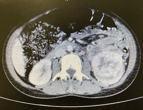 The patient was then discharged on September 2, 2020, for outpatient follow-up with an oncologist, palliative care physician, and radiotherapist. He underwent new computed tomography of the abdomen and pelvis in late September 2020, which demonstrated an extension of the renal injury to the ileopsoas muscle and the presence of a thrombus in the left renal vein, in addition to multiple retroperitoneal lymph nodes.
