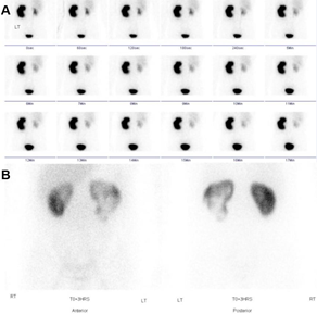 Figure 2 Nuclear renography assessments. (A) 99mTc-MAG3 renogram showing delayed and virtually no drainage of the radiotracer after Frusemide injection. (B) D99mTc-DMSA MSA showing irregular parenchymal thinning and scarring, and absent cortical uptake in the left lower kidney.
