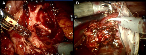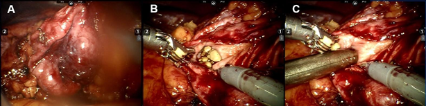 A 4.8-Fr multilength JJ-stent and a 5-Fr ureteric catheter were inserted over sensor wires into the left ureter via cystoscopy. The patient was then placed in a right lateral position. We used a transperitoneal 4-arm approach with a 30-degree lens, fenestrated bipolar forceps, monopolar curved scissors, and prograsp forceps. After mobilising the descending colon and dissecting through Gerota’s fascia, the grossly dilated and thinned left lower kidney was identified (Figure 3A).