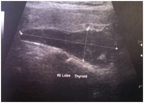 Biology: PTH>560pg/mL (dosed twice) with a calcemia>130mg/L, creatinine clearance=24mL/min. This chronic renal failure has long been considered secondary to a diabetic nephropathy but the chronic renal failure was strongly in favor of an interstitial nephropathy secondary to a chronic hypercalcemia because there was not any diabetic retinopathy. The cervical ultrasound showed a macro parathyroid nodule (45mm, (Figure 1). The osteodensitometry revealed an osteoporosis (T Score<-2.5). The patient received an adequate hydration and bisphosphonate treatment (three injections of ibandronic acid) before addressing her for the parathyroid surgery.