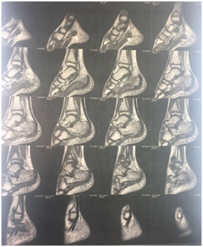 A well-built 14 years old boy presented with severe constant right heel pain which was increased by physical activity, and relieved partially by NSAIDs. He was physically active. The patient denied trauma or fever. He reported no history of other musculoskeletal symptoms. At that time physical examination was apparently normal apart from mild swelling and localized tenderness over the posterior right heel. Laboratory tests were significant for elevated ESR (69 mm) and CRP (12.5 mg/dl). CBC, liver & kidney function tests were normal. RF was negative. X-ray heel findings showed fragmentation &increased density of calcaneal apophysis. Although the patient’s clinical history, the overuse of sports activity, together with the radiographical findings were in line with calcaneal apophysitis (sever’s disease), the unexplained elevation of ESR & CRP made us to proceed to magnetic resonance imaging (MRI)to exclude osteomyelitis. The MRI demonstrated oedema of the calcaneal apophysis with patchy oedema of the calcaneal bone as well as the overlying soft tissue that consistent with Sever disease (Figure 1). Oral anti inflammatory medication was prescribed in addition the patient was advised to use heel raise shoe orthoses and to restrict sports for 6weeks.