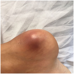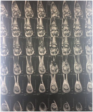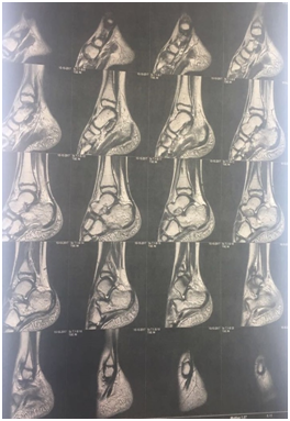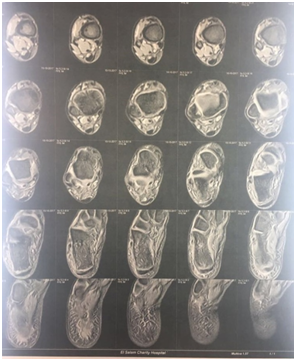 3weeks later, the pain became more intense & agonizing. Her mother reported that her son returned playing foot ball with bare foot. On examination the right posterior heel was swollen, red and tender (Figure 2). This represent a great challenge, being the osteomyelitis provides itself again as a strong diagnosis. Although the MRI is the best available imaging for detecting early osteomyelitis, we used the ultrasonography together with X-ray as preliminary study before considering re-MRI.