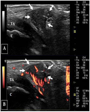 Figure 4 legend (A) Gray-scale and (B) power Doppler long-axis ultrasonography on right heal show well delineated soft tissue collection (arrows) on the side of tendoachiles with increased vascularity. (C) & (D) represent gray-scale and power Doppler short-axis views respectively on the soft tissue collection. TA: tendoachieles; C: calcaneal bone.