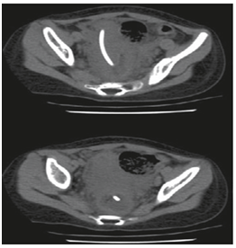 Abdominal X-ray and ultrasound (US) examinations confirmed the absence of peritonitis or pneumoperitoneum. However, CT abdomen revealed a hyper dense catheter projecting inside the descending colon. There was no free fluid in the peritoneal cavity (Figure 1). The patient was commenced on intravenous antibiotics and subsequently, the ventricular catheter was retrieved via an incision over the scalp. By pulling the protruding end through the anus, the distal catheter was then removed. The patient was kept under close observation for any sign of peritonitis or perforation for 5 days. Afterwards, she started oral feeding gradually and was discharged on the 6th day. No further problems were noted during regular follow-ups at the outpatient clinic.