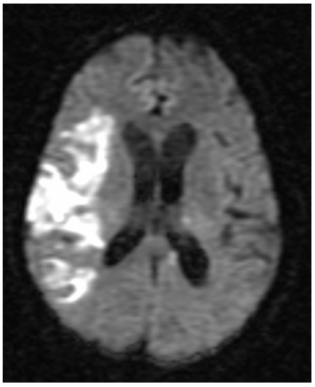 Furthermore, a chest CT scan was performed, showing a lung lesion in the low left lobe including left bronchus, lung lymphadenopathy, left pleura metastatis, left kidney stroke and bilateral suprarenal metastasis. A brain MRI confirmed right middle cerebral artery stroke, left posterior- inferior cerebellar artery stroke and right anterior cerebral artery stroke (Figure 3).