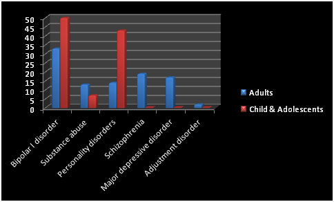 Conclusion: While the annual incidence of suicidal behavior in inpatient adults and child & adolescents was comparable, bipolar disorder was the most frequent serious mental illness among suicidal subjects of both groups. Moreover, self-mutilation was the preferred method of suicide in adult and child & adolescent psychiatric inpatients.