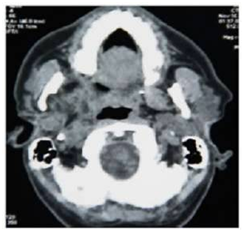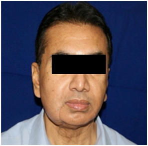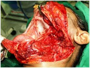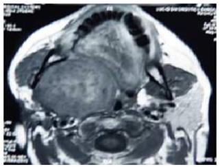 A 59-year-old male presented to the unit complaining of a gradually increasing, painless swelling in the right parotid region since 4months. The swelling was associated with dysphagia and dysphonia. Patient gave history of pleomorphic adenoma of right parotid 15years back following which he underwent superficial parotidectomy. Pleomorphic adenoma was diagnosed by Fine needle aspiration cytology (FNAC) technique. MR imaging revealed a dense extensive, homogeneous mass, 5cms in diameter, originating in the right deep parotid lobe and extensively involving the parapharyngeal space (PPS), base of skull and infra-temporal fossa pushing the soft palate to one side. Patient was admitted for definitive surgical management. He underwent excision of the lesion via paramedian mandibular osteotomy for access to the lateral pharyngeal space, base of skull and infratemporal fossa to completely remove the tumor while preserving the facial nerve. Post-operatively, the patient recovered uneventfully with no facial or inferior alveolar nerve deficits and no osteotomy related complications resuming normal mandibular movements (Figures 1-3).