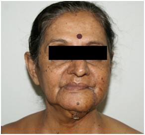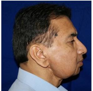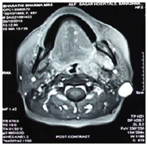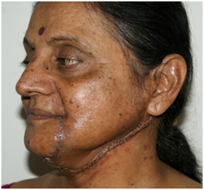 A 63-year old female reported to the unit with a gradually increasing, painless swelling on the left side of neck from past 4months. Patient did not have any signs and symptoms of dysphagia and dysphonia. Patient gave a history of superficial parotidectomy of left parotid gland 23years back along with radiotherapy. On examination, a well-defined, 2cms lesion was found in post-auricular region which was fixed, non-tender, and firm in consistency. Another well-defined lesion of 2cms dimension was present in the left submandibular region near angle of the mandible. Fine needle aspiration cytology (FNAC) was suggestive of pleomorphic adenoma of deep lobe of parotid. MR imaging revealed a well-defined, large lobulated mass, extending from the left ramus of mandible with extension into the parapharyngeal space (PPS) medially and another oval mass in left retro-auricular region superficial to sternocleidomastoid muscle with another lesion in the pre-auricular region. Patient underwent surgical excision with paramedian mandibular osteotomy to access the tumor of the deep lobe. She withstood the procedure well with no residual functional or esthetic deficits (Figures 4-6).