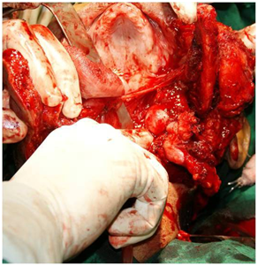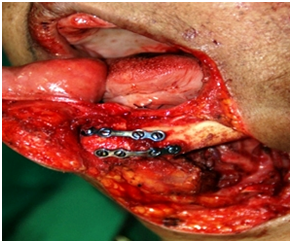 Figure 5 (A, B, C) - Enucleation and excision of the entire mass in-toto with swing mandibulotomy with the mandible dislocated superiorly; fixation of the mandibular segments was carried-out with mini plates and screws. (Case 2)