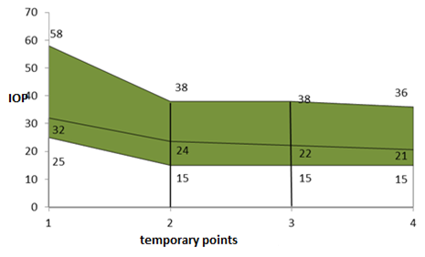 Using the Mann-Whitney test, IOP was compared before surgery with IOP of the remaining time intervals. M±m –average value with standard error, N–number of eyes, Min/Max–minimum/maximum value of IOP. The Mann-Whitney test showed that statistically significant (significance level p<0.05) is IOP a day after the operation and IOP at discharge, i.e. there is a difference between IOP in patients diagnosed with NVG and POAG. That means, that in the group of patients with NVG and POAG, a significant difference is present between the initial IOP, the pressure measured one day after the operation and IOP at the end of the time. If to pay attention to the indicators of mean values, then after one session of MTCCDLC, IOP decreased on average 11.39 mmHg (Figure 1) (Table 1).