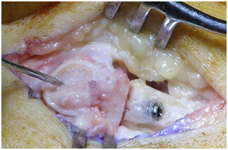Tourniquet was used for all cases. A dorsal longitudinal incision was made and extensor tendon was laterally retracted. The Meta-Tarso-Phalangeal (MTP) joint as well as the distal metaphysis of the metatarsal bone was exposed. All patients underwent debridement of the MTP joint with removal of loose bodies and synovetomy if needed. A long oblique dorsal wedge osteotomy was performed with an oscillating saw offloading the diseased dorsal cartilage allowing shortening (Figure 1). The metatarsal head was rotated, brining the intact plantar aspect of the articular cartilage into articulation with the proximal phalanx and fixed with a single Barouk headless compression screw (Figure 2). The degenerate articular cartilage was debrided (Figure 3). Microfractures were created using k-wire (Figure 4). The incision was closed with vicryl sutures and 20ml 0.5% Chirocaine was administered as an ankle block. If deemed appropriate, they were offered physiotherapy to optimise mobilisation exercises. All operations were undertaken by one orthopaedic surgeon to eliminate any intra-operative technique variability. Postoperatively patients were mobilized as able in a heel weight bearing shoe for 6weeks. Once radiographic evidence of union was noticed normal shoe wear was gradually resumed. Clinical and radiological assessments were performed at 6 weeks after surgery and periodically at three, six and twelve months and then yearly.