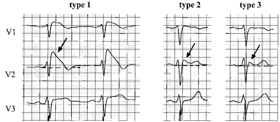 Figure 2 ST-Segment Abnormalities in Leads V1 to V3, T wave negative in type I with biphasic or positive in type 2 and 3, Variability in ST elevation in type 2 and 3.6