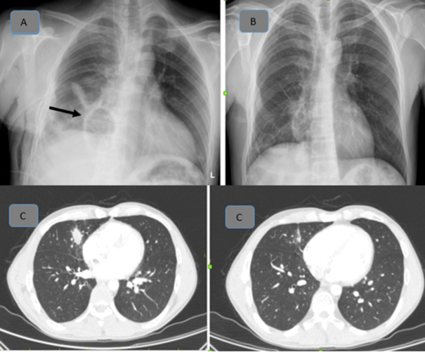 A 34-year-old male patient presented to the emergency department following a motorcycle accident resulting in multitrauma. Despite an unstable general condition, vital signs remained stable. The patient underwent multidisciplinary evaluation, revealing liver and spleen injuries, right hemopneumothorax, diffuse subcutaneous emphysema, and large traumatic cysts in the right lung (Figure 1). Additionally, fractures of the right 4th, 5th, 6th, and 7th ribs, right scapula, proximal humerus, and right olecranon avulsion fracture were identified through imaging studies. Immediate right tube thoracostomy was performed in the emergency room, followed by surgical intervention by the general surgery team and completion of orthopedic treatments. Subsequent to tube thoracostomy, due to minimal drainage, absence of significant air leakage, and radiographic confirmation of lung expansion within the right hemithorax, a decision was made for conservative management with close observation. Following approximately two weeks of intensive care unit monitoring, the patient was transferred to the ward. Chest tube removal was conducted in the ward, and the patient was monitored for an additional hour. Sequential posteroanterior (PA) chest radiographs taken at regular intervals revealed a reduction in size of the giant cysts with fluid accumulation. Upon stabilization of clinical status, the patient was discharged. Subsequent outpatient clinic evaluation two months later demonstrated regression of the giant cysts on thoracic CT imaging (Figure 2A–2C).