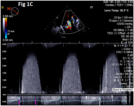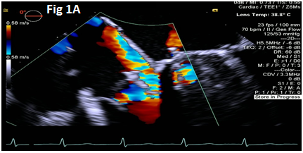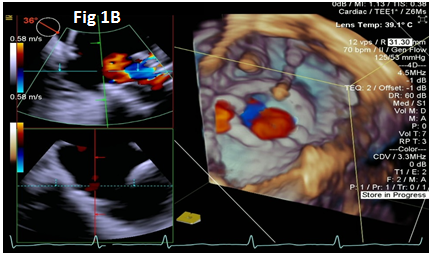 Figure 1 Para-valvular leak shown by color Doppler (1A) on 2D and 3D (1B) images, along with dense tricuspid spectral Doppler signal with peak velocity of