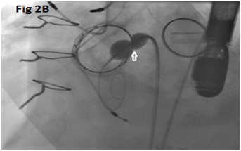 Figure 2 Multi-purpose diagnostic catheter (MPA) crossing through the PVL proximally and through the S3 cells distally (A), balloon inflation over a wire passed through the PVL channel confirms the position of hour-glass shaped inflated balloon with proximal half outside & distal half inside the S3 cage and waist in the middle (B), along with failed attempt to cross the MPA (white arrow in C) with Safari wire along with Zmed balloon inside the S3 (black arrow).