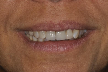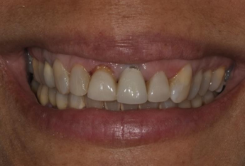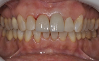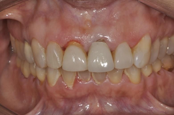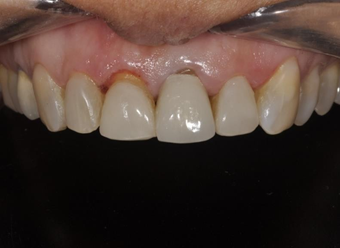 Patient I. A., female, 47 years old, attended the dental office with the chief complaint of dissatisfaction with her anterior teeth and smile. On clinical examination a ceramic veneer was found on tooth 11 with altered color, irregular shape and contour, and on tooth 21 an all-ceramic crown with altered color was found. Both restorations had different colors and volumes, as well as the gingival apex on both teeth was discrepant (Figures 1-3).