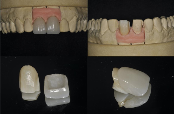 In the present article, a clinical sequence of esthetic rehabilitation of the anterior sector was reported, using all-ceramic restorations, individualized and planned in order to achieve the highest possible esthetic result. Due to the differences in thickness of both restorations, a double cementation strategy was chosen, whereby the crown of tooth 21 would simulate a preparation for a ceramic veneer identical to that of tooth 11, which would subsequently be cemented using the same light-curing cement, thus enabling a uniformity of the final color of the restorations.
