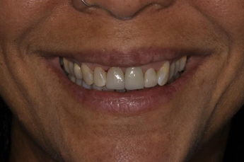 Figure 1 Initial photograph showing the discrepancy in color, shape and size between the restorations.