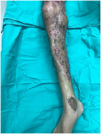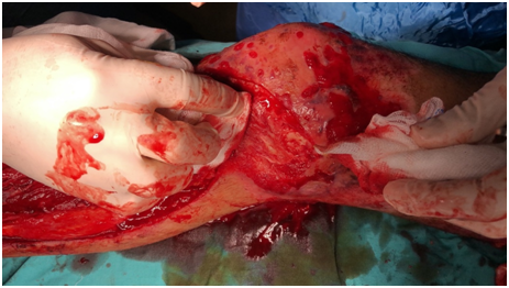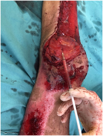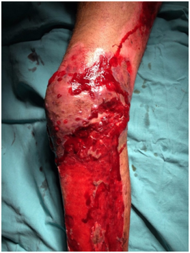 A 30-year-old male patient applied to our emergency department with a traffic accident. An open wound was found on the anterior of the right thigh, medial of the knee, and anterior of the tibia. No fracture was detected in the X-ray. The patient was hospitalized. Debridement was performed after antibiotherapy, and vacuum assistant therapy was applied. He was taken to the operating theater after the wound swab culture was negative. All wounds were grafted. The patient was discharged with oral antibiotherapy. After one week, grafts on the anterior of the crus and the medial knee were failures. A gastrocnemius muscle flap was planned for the patient.