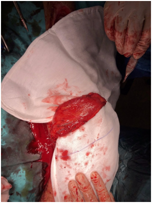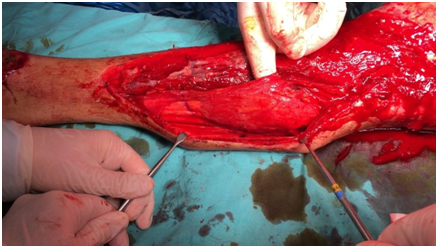 Under general anesthesia, fail grafts were debrided in the right medial knee and the anterior of the crus. After debridement, the wound on the anterior of the crus was graftable, but the exposed tissues were found medial and inferior to the knee (Figure 1-2). In the supine position, the incision was started 2–3cm posterior of the medial border of the tibia. The incision was continued from 5–6cm inferior of popliteal to 8–10cm proximal to the ankle. Skin and subcutaneous tissue were elevated. The fascia of the gastrocnemius muscle was excised from the superficial posterior part. The avascular plane between the gastrocnemius and soleus was reached by blunt dissection. The plantaris muscle between the muscles was preserved. The median raphe between the lateral and medial muscle parts was seen in 1/3 of the proximal leg. The course of the sural nerve was seen, and the nerve was preserved. The flap was dissected from distal to proximal. Approximately 1cm of Achilles tendon from the distal was cut with cautery and included in the flap (Figure 3). The flap was elevated from the median raphe level to proximal. Dissection was continued bluntly as the sural nerve passed proximally between the two heads. The flap was elevated (Figure 4) and inset on the defect. Blood was collected from the patient, and PRP was obtained by the method used by Orhan et al.,6 Approximately 1ml of PRP was applied to the flap (Figure 5). Flap and other parts were covered with a partial thickness skin graft. The donor site of the flap was closed primarily, and a hemovac drain was placed (Figure 6). Wound dressing was done. The operation was terminated by splinting the leg.