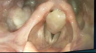 Figure 1 photo taken during nasofibroscope examination showing a large posterior glottic polyp.