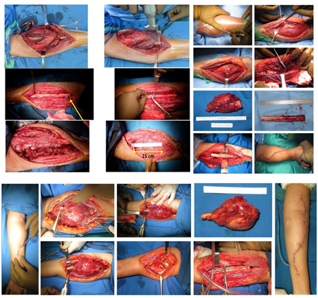 We performed wide excision and reconstruction using non-vascularized fibular graft for the patients. The tumor was easily demarcated. After the tumour was exposed and the radial nerve is preserved, tumor was excised widely. Then we evaluated the margin of the wound, did proximal radius osteotomy. After tumor was removed, we did allograft transplantation of non vascularized fibula in order to reconstruct the gap and fixed using plate, screw, and mesh. We used small implant DCP with 10 holes or recon plate 3.5. Finally we decided to perform primary